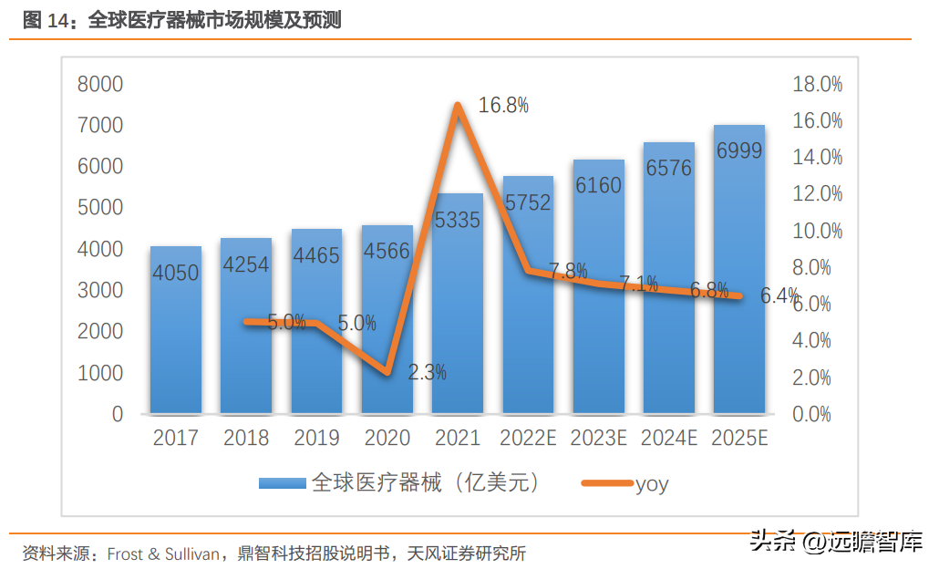 根据 Frost & Sullivan,2022 年全球医疗器械市场估计达到 5752 亿美元,预计 2025 年达到 6999 亿美元(折合约 4.95 万亿元人民币),CAGR 为 6.8%。