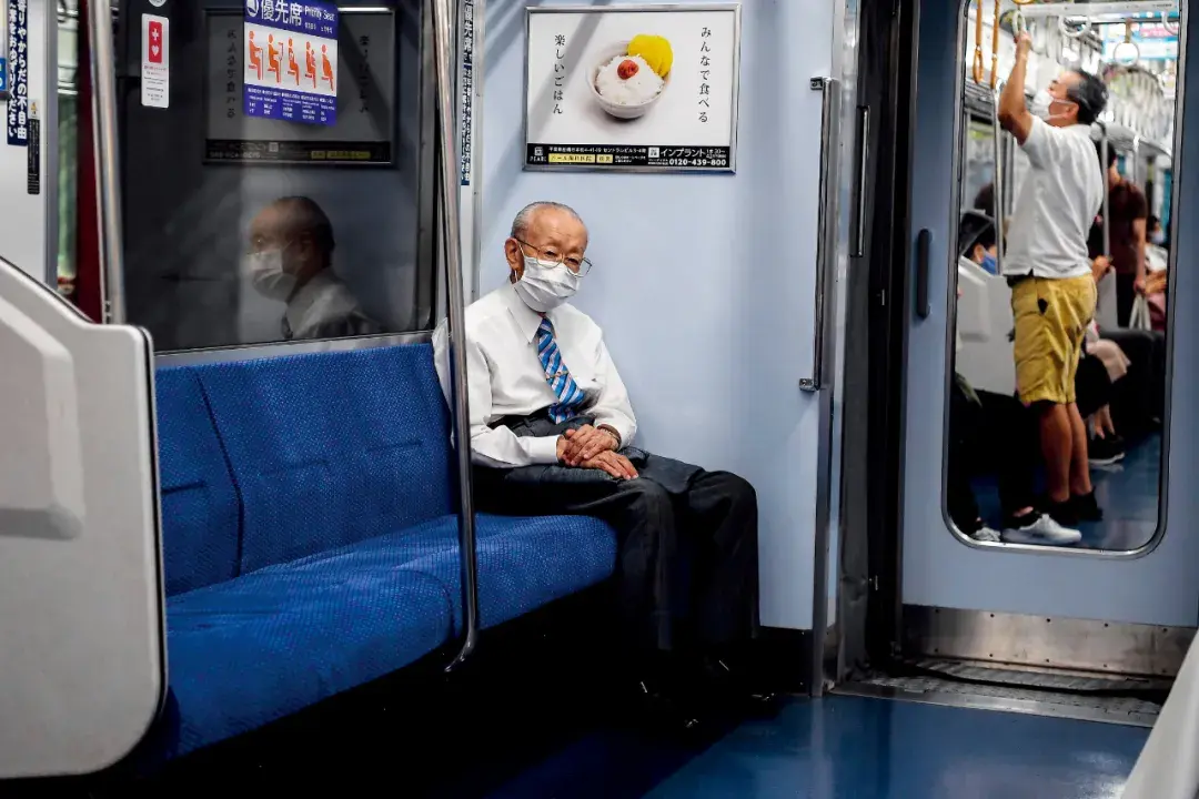 (2020年9月8日,东京列车上的老年乘客。图/人民视觉)