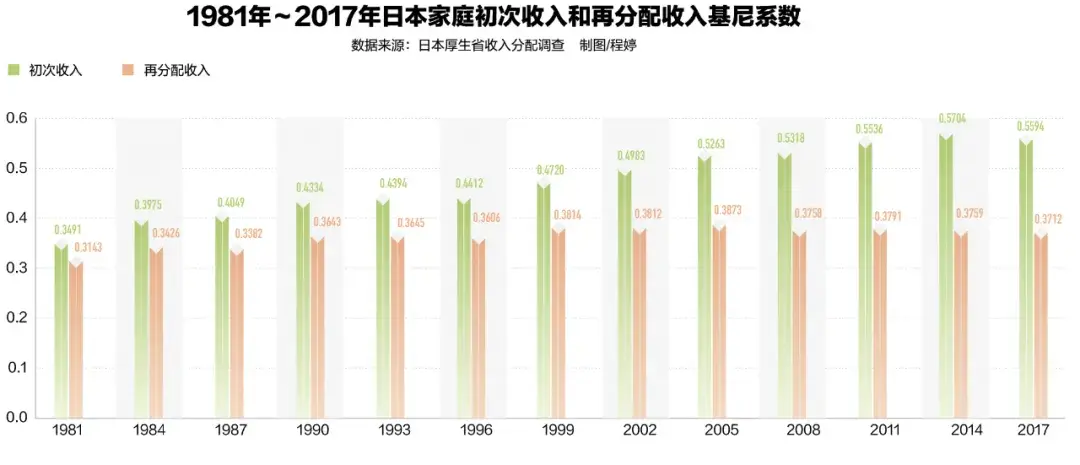 基尼系数是衡量一个国家收入差距的通用指标。2017年日本家庭收入的基尼系数是0.3712,日本的贫富差距并不大。把以初次收入为基础的基尼系数和以再分配收入为基础的基尼系数进行比较,就可以看出一个国家的税收和再分配机制是否可以有效地平抑收入差距。日本负责社会福利的厚生省,每三年作一次家庭收入分配调查,分别计算初次收入和再分配收入的基尼系数。2017年的调查显示,以家庭初次收入(包括工资收入和各种财产性收入)计算的基尼系数为0.5594,经过税收调整和转移支付后的家庭收入基尼系数则为0.3712,比初次收入的基尼系数下降了1/3,说明税收和转移支付政策有效地降低了家庭收入不平等。