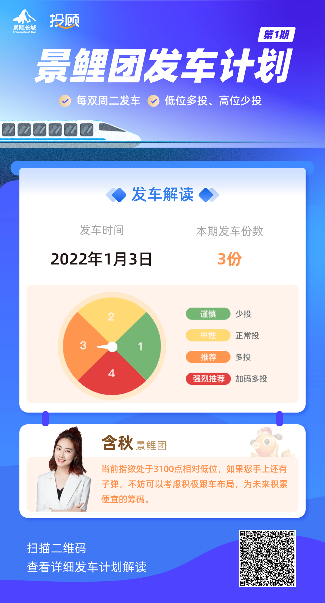 景鲤团发车计划是景顺长城投顾推出的,每双周二发车服务。简单理解,也就是