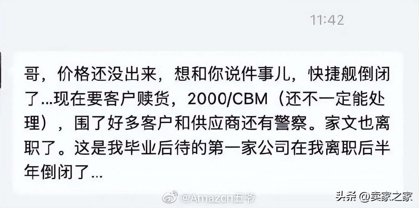 今日,各大社交平台都在传深圳货代某捷舰资金链断裂,要求客户以2000元/cbm赎货的消息。