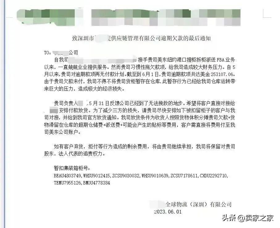 此外,根据曝出的一张逾期欠款通知显示,深圳另一家物流公司指责涉事货代拖欠其物流费用数十万美金。